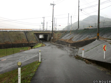 北に向かう路線は病院の敷地内を抜け、県道233号線を横切ると再度一車線道路(写真T)に転換される。未舗装路と舗装路が混在しながら、下関市の施設、菊川温泉までつながっていく。現地で、温泉水排水のため鉄道用地を道路に変え、その下に下水管を埋設し処理場まで送っていること、土地を所有していたサンデン交通は代替地を譲り受けて分譲売却したこと、等の話を教えもらった。