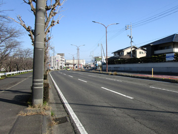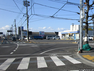 南東に向う路線は痕跡の消えた新興の住宅街を進み、国道2号線バイパスを越えて宮道(写真P)に至る。ここも小さな空き地に駅跡を示す案内板が立てられ、鉄道の歴史を後世に伝えている。