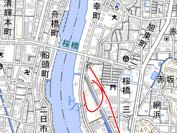 駅を出ると鉄道側はやや右に曲がり、逆の左方向に進路を取る道路と一旦分離する。以降の鉄道用地は宅地等に細かく分断され、跡地の確認は難しくなる。南西に位置する荒神社を過ぎると左急カーブで向きを変え、冷凍倉庫会社の敷地内に入り込む。この中に置かれたのが、新旧ルートの分岐駅二代目桜橋(写真E)で、貨物駅として開業している。当駅までが延伸された新線区間となる。