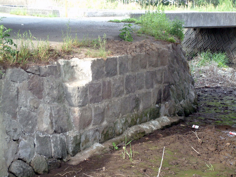 次に、未成線の痕跡ですが、田深を過ぎた辺りに橋台跡が残されております。残念ながら片側は遺失しており、残る方も上部が削られておりますので、橋間や高さは不明ですが、現国道の真下にありますので、軌道跡を国道に転用した区間であることは間違いなさそうです。