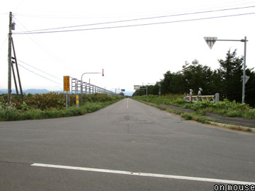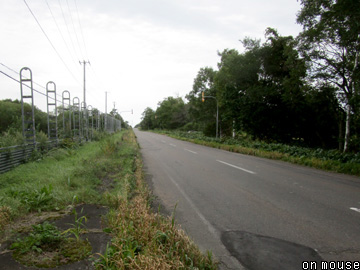 一区画過ぎた先が椴山(写真D)で、以前に何か施設でもあったのか舗装された大きな更地が広がる。ただ駅跡の痕跡は認められない。また駅の北を横切る天然林(写真E)では軌道跡のみ低木が多く、廃止後は作業道として利用されていた雰囲気も感じ取れる。さらに牧草地内を北上したのち、東西に走る国道244号線との交点からは二車線道路(写真F)に転用される。