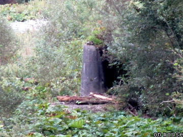 道路はやがて忠類川を越える。軌道は右手下流を渡っていたが、廃線跡が道路転換された際、橋梁も道路用に手直しされた。その後、上流側に新橋ができ、さらに上流側に移設されたのが現在の道路橋となる。その橋上から下流を遠望すると、右岸に橋脚(写真G)を確認できる。ルートには一致するものの、軌道時代の遺構か、道路橋化によって新設されたものか、外観のみでの判別は難しい。