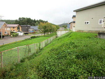 北東に進む路線が東に向きを変えると、右手に小さな公園が現われる。ここにトニカ(写真N)が設けられ、トイレ付近に乗り場があったこと、集落の西はずれに木材集積の土場があったこと、道路上に線路が敷設されていたらしいこと、等の話を地元で聞いた。なお馬鉄時代にはここからペンケ沢までの支線も延びていたが、こちらの情報は一切収集できなかった。