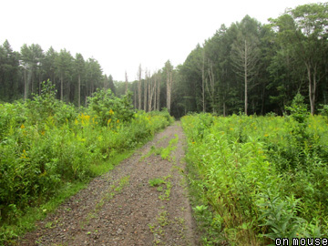 この先はルートが二手に分かれる。東に向かう専用線時代の旧線と、南東の厚真市街地に向かう旅客営業時代の新線で、地元では「馬鉄」「ガソリン車」と区別して呼ぶこともあるようだ。旧線側(写真N)は農地の中に消えてしまったが、以前は路盤を利用したと思われる排水路が残され、周囲からも跡地を確認することができたと聞いた。