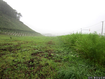 駅を過ぎ更に進むと、道道は上り勾配に差し掛かりゆるやかな丘陵地を進む。ここで鉄道側(写真W)は勾配を避けるため道路と別れ、用水路と共に山裾に沿って進む。地図によると水路の北側を走っていたはずだが、放置され荒れ放題となった路盤上を直接たどることは難しい。