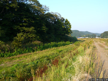 新線側は道道沿いのアパート横をかすめて進むが、ここに当時の築堤(写真I)が姿を見せる。ただ放置された路盤上は藪地に変わり、足を踏み入れることは難しい。この築堤も近悦府川で途切れ、対岸は農地に飲み込まれて痕跡は消える。近年品質の向上が目覚ましい稲作の田んぼだ。