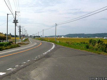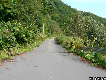 さらに小さなカーブを繰り返しながら進むと、やがて右手の視界が開け、ようやく人家が目に飛び込んでくる。道路も未舗装から舗装路(写真L)に変わり、そのまま二車線道路に合流するが、すぐ道道10号線に突き当たって終了してしまう。