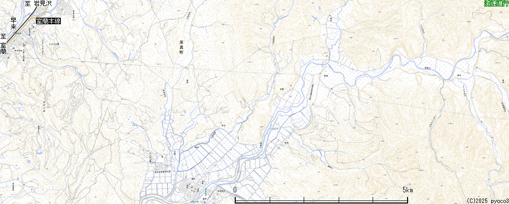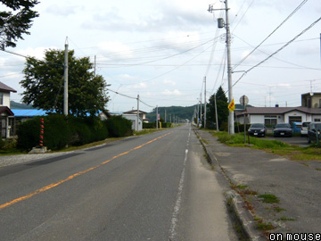 農地を抜けると専用軌道のまま道道に再合流し、やがて厚真川を越える。屈曲した旧道は軌道跡を取り込んで直線化され、対岸で小さく南にカーブする。この右手に終点の幌内(写真Y)が置かれていた。