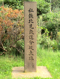 終点水上は鉄道の雰囲気が完全に消滅し、国道脇に建てられた駅跡の案内板と石柱(写真J)だけが、なんとかその存在を教えてくれる。ただ当時の空中写真で確認すると、駅はこの地点より100m程北に位置したように読み取ることも可能だ。