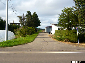駅南方の右カーブは鉄道時代の築堤が道路に転用されるも、十六線道路を越えると北海道独特の大きなうねりを持った牧草地に飲み込まれ、鉄道が走っていた雰囲気は消える。次に路線が現われるのは国道391号線に合流する南六号道路付近(写真E)からで、この先の国道は鉄道用地を拡幅転用して建設された。