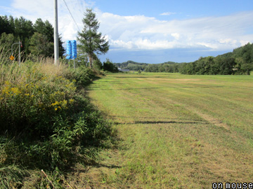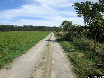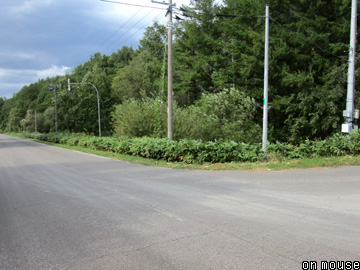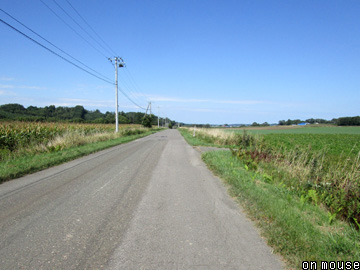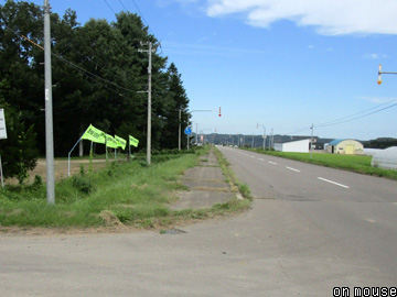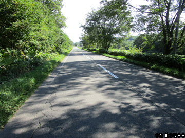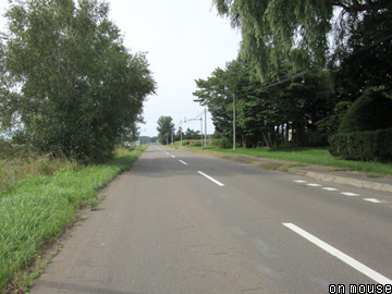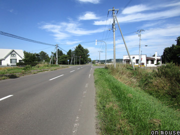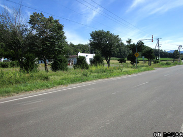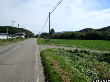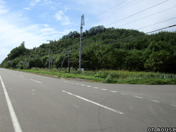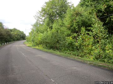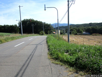 福山駅で分岐した東洋沢支線は、直後から雑木林に入り込み、その後の牧草地を含めてルートのトレースはほぼ不可能となる。かなり南方に飛んだ後、町道153号線(写真AA)に接近するが、やはり軌道跡の判別は難しい。