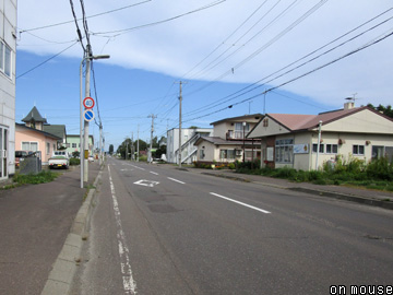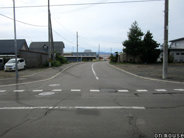 殖民区画を斜めに横切っていた道道は、やがて南北に走る南二線に合流し、軌道側もこれに追従する。同所に置かれていたのが宮ノ前(写真R)で、駅名の元になったと思われる上東神社は一区画西だ。