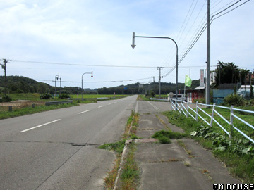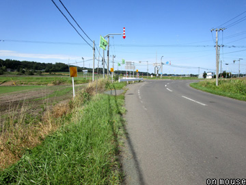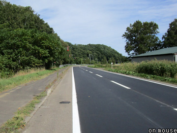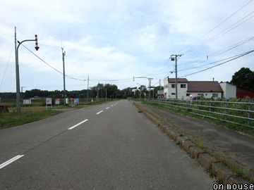 南西に向かう路線は市街地を抜けると道道102号線(写真P)に再合流し、今度はその東脇を併走する。