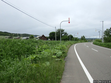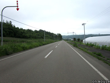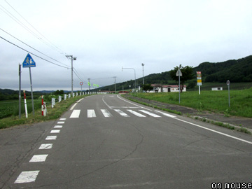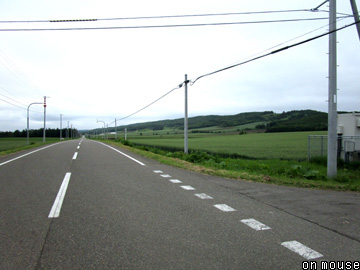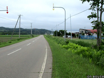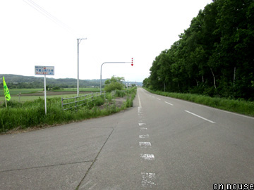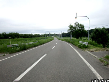 川を越えると左カーブを描き、再度農地内に飛び込む。さらに一旦別れた道道と交差し、その位置を北側に移す。