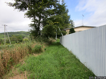 ここで北に向きを変えた後は道道496号線の旧道と並行して進むが、線路跡の大半は現道道への転換(写真E)、あるいは拡幅用地として提供されている。