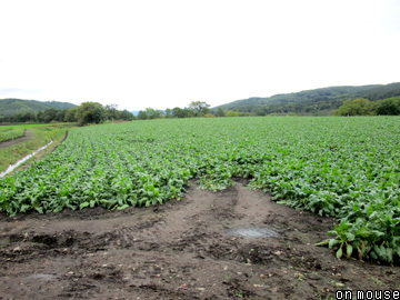 駅の北には軌道跡を利用したと思われる未舗装路が続くが、二車線道路に突き当たって終了してしまう。ここで左カーブを描いて向きを変え、集落の北外れを西に向かう。跡地は既に農地(写真B)に飲み込まれ、何の痕跡も見いだせない。