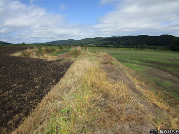 しばらく道道と一緒に北西へと進んだ後、ゆるやかな右カーブを過ぎた地点で道路から右手に分離する。ただしその跡地は既に農地に再利用され、ルートはおろか途中の十号さえ確かな位置を見出すことは難しい。駅の西を流れる増田沢川の先に再び水路(写真M)が開削され、ここも線路跡の転用と考えてよさそうだ。