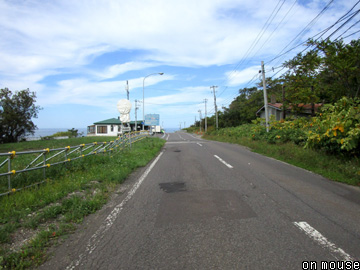 北東に向かう軌道線はそのまま海岸線に近づき、同所を走る国道(写真P)に再合流する。この先、山側を走る旧国道は廃棄され、軌道跡が新たな新国道ルートに選択された。