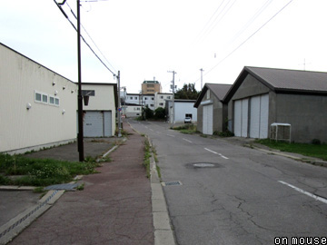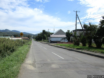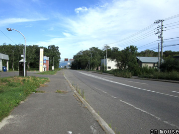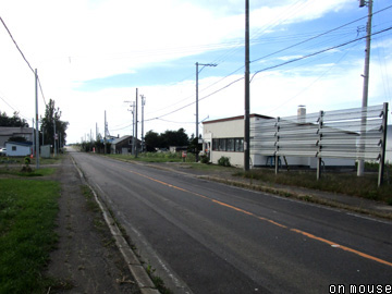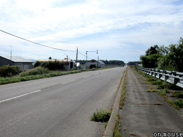 東に向かう本線側は現在のJA倉庫群の前を通り抜け、道道92号線(写真C)に合流する。当時は道路北側に専用軌道を構えていたが、その後の道路拡幅によって今は歩道に置き換えられた。