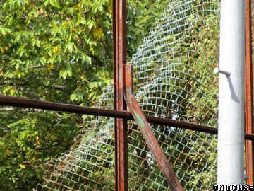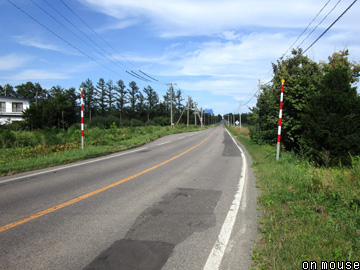 東八線で国道はさらに北へとカーブするため、直進を続ける軌道側は道路と別れ農地(写真I)の中を進む。東十線(写真J)まで達すると、今度は殖民区画に沿って北上し始める。途中、左手の峰浜小学校グランドに備わるバックネット骨組(写真K)に軌道のレールが使用され、廃校となった現在も大きく朽ちることなく、その姿を見せている。