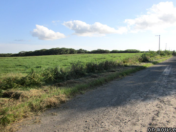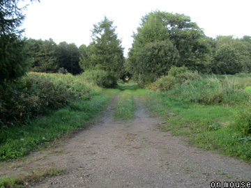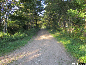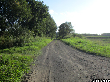 相変わらず牧草地内を駆け抜ける路線は、一旦四十一線で右に折れ、国道272号線を踏み切った後、南八号で左に折れ戻す。線路跡の状態はほぼ変わらず、一部に若干路面状態の良い未舗装路(写真M)が織り交ざる程度だ。