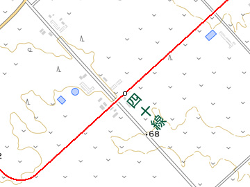 途中、北海道遺産となった180m幅の格子状防風林を斜めに抜け、やや飛んで殖民区画の二十八線と交差する。この手前に置かれたのが盛進(写真E)だが地形図に記載は無く、殖民軌道各線別粁程表の新西春別起点26969mを計測して場所を特定した。