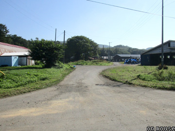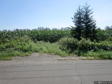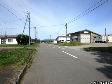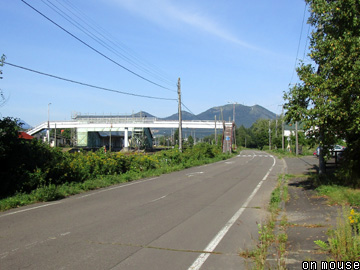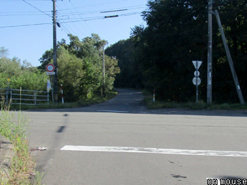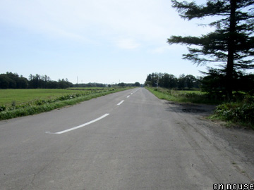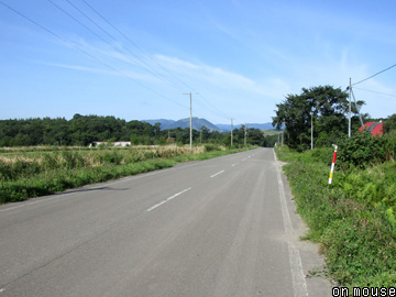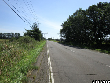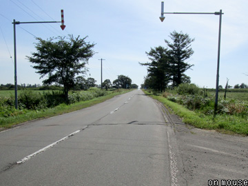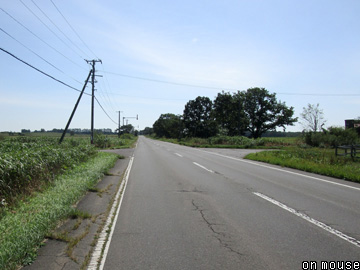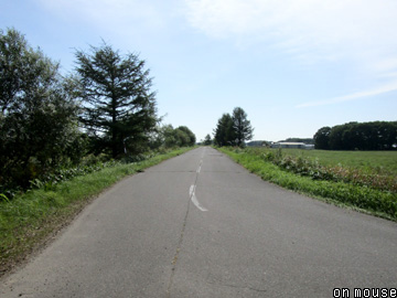 駅をやや過ぎた地点(写真S)で一旦新旧ルートが分かれる。計根別飛行場の開設に伴う移設で、道路上を進む新線に対し旧線は左方に向きを振り、再び牧草地内に飲み込まれる。