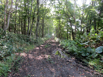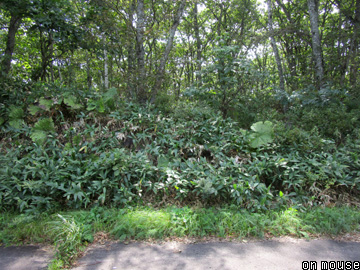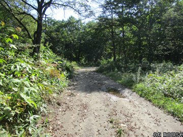 しばらくは屈曲した道が続き、途中二箇所目の右カーブ地点で明治30年に廃止された釧路鉄道跡と交差するも、痕跡は認められない。さらに東へと向きを振って東弟子屈(写真C)に至る。駅を出てしばらくすると道路は突然右に折れ、直進する軌道側(写真D)は農場施設内に入り込んでしまう。これを抜けた先は丘陵越えの林道(写真E)として転用されるも、雨上がりで路面状態は悪く、加えて生い茂る雑草にも邪魔され今回は通り抜けをあきらめた。