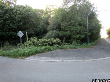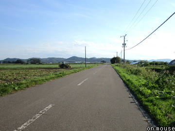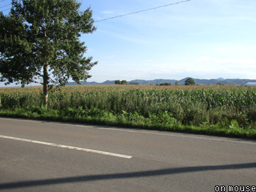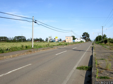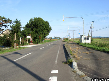 さらに進むと軌道は東二号から右に分かれ、トウモロコシ畑(写真G)へと飛び込む。現状からは何の痕跡も見いだせないが、当時はここから南に向かう道路が区画内を斜めに横切り、東四号まで達していた。軌道側もこの町道を利用し、一旦、東三線(写真H)に吸収されたのち再び斜めに進みはじめ、東四号(写真J)上で南東に向きを変える。