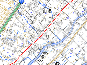 大正15年開設の山添(地図K)もやはり地形図に印されず、起点からの距離程3哩70鎖47節(6246m)を計測し、位置を判断した。なお同駅は正規駅にもかかわらず、必要に応じた臨時期間のみ営業するとされ、昭和13年には早くも閉鎖された。