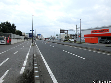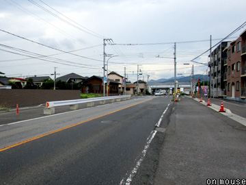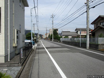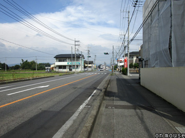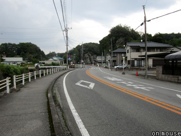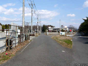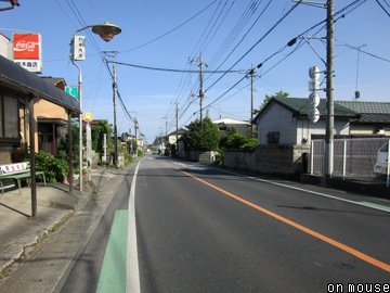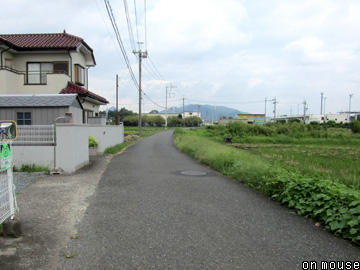同駅の北で道路はゆっくり左に曲がる。ここで軌道側は県道と別れて直進し、今度は生活道に転換される。道幅は狭く、当時の用地幅そのままのようだ。続く緩やかな左カーブ終了地点で、右手から同様の生活道(写真AP)が合流してくる。この道も第14師団の練兵場へ続く線路跡と現地で聞いた。前記、初期ルートの裏付けとなる。