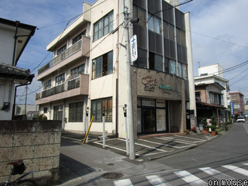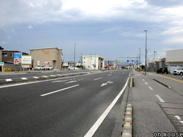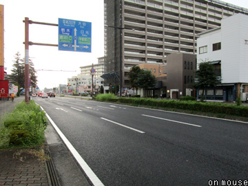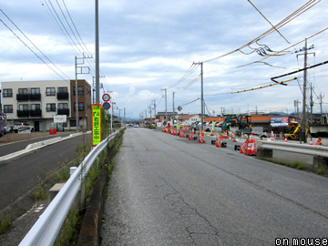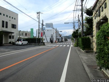 その手前が野洲人車鉄道の起点戸祭(写真AH)となる。当時の図面から、エステサロンが入居する3階建ビル付近と読み取れる。ここからは併用軌道区間に入り、国道119号線との交差以北は道幅も二車線に広がる。