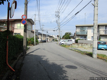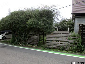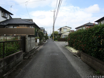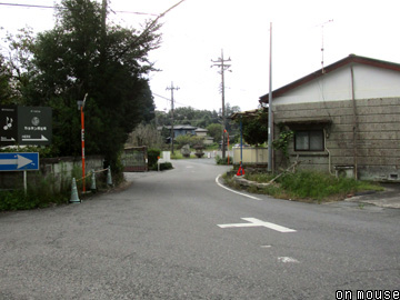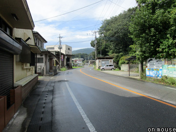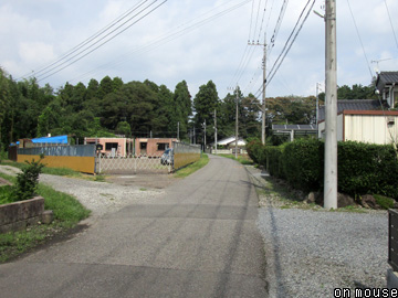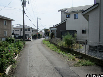 | 県道との交差後は民家や空き地(写真BH)、更に生活道や藪地が交互に現われる。国道293号線に近づくと道の駅ろまんちっく村の駐車場などに利用され痕跡はかき消されている。 |