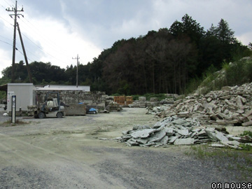 立岩に向かうルートは後発の軽便線と二度交差する。しかし実際に両者の交差はなく、同線建設により競合する軌道側が廃止されたと捉えてよさそうだ。その路線は瓦作街道と呼ばれる市道上をしばらく進んだのち二手に別れ、一方は採石場の事務所前(写真T)に至る。