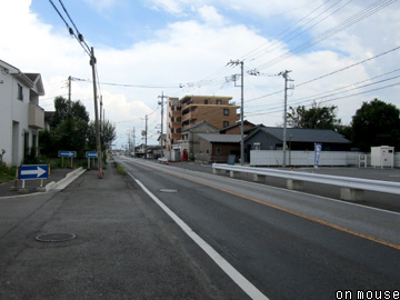 一区画を抜けると再び舗装路が始まり、当時のルートに一致するも線路用地を転換した確証は得られず、途中に置かれた南仁良塚(写真AS)にも目印は何もない。さらに東北道を越え再び県道22号線の右脇に並ぶが、既に道路拡幅に利用され、東側の歩道部分が線路跡かと推測するにとどまる。