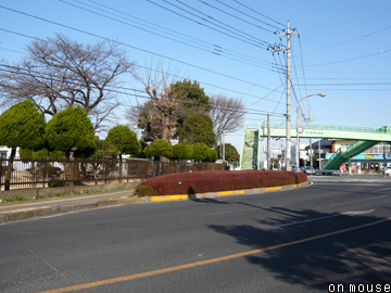 | 駅を東に出て左カーブで向きを北に変えると、なかよし通りと名付けられた遊歩道(写真B)が始まる。この先は軌道線跡が一旦専売公社の引込線に利用され、更に遊歩道へと転換された経緯を持つ。楡木街道の手前で公社線は左カーブを描き、工場跡地の中央公園に突き当たって終了する。 |