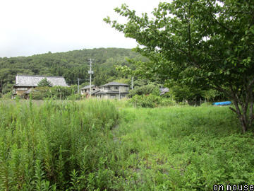 ルート上の空地はやがて細道(写真U)に変わり、藪地で行き止る。この中にも草に絡まれつつ電柱がどうにか姿を見せ、道しるべとして利用できる。ただし旧国道と併走していた区間で、軌道跡と廃道跡の明確な区分けは難しい。登り坂で続く跡地の勾配がきつくなり始めた直後、温泉旅館の駐車場内に飛び出る。ここは建物に合わせて盛土された可能性が高い。