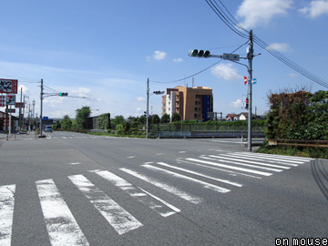次の行衛(地図AD)付近は全面的な区画整理が実施され、道路との位置関係が完全に崩れている。やむなく過去の空中写真を重ねた上で16013mの距離程を計測し、それでも大雑把な位置の把握にとどまる。